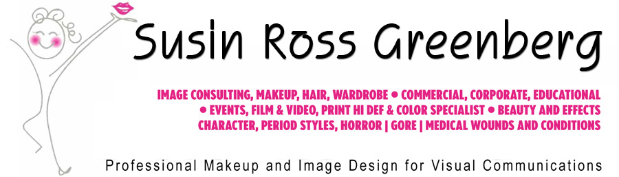 Susin Ross Greenberg: An experienced, extremely creative, highly skilled and energetic Image Designer and Consultant. Professional Makeup, Hair & Wardrobe Styling for Commercial, Feature, Educational, Corporate, Stage and Live Events. Hi-definition makeup application pioneer, health & beauty product specialist, special effects designer and air brush artist brings over 20 years experience creating perfect visual images for beauty, character, period stylizations, gore, medical wounds and conditions.